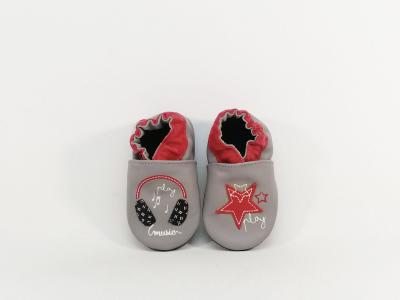 Chausson de naissance bébé en cuir souple gris rouge motif music play, 0 à 6 mois en destockage ROBEEZ à pas cher.