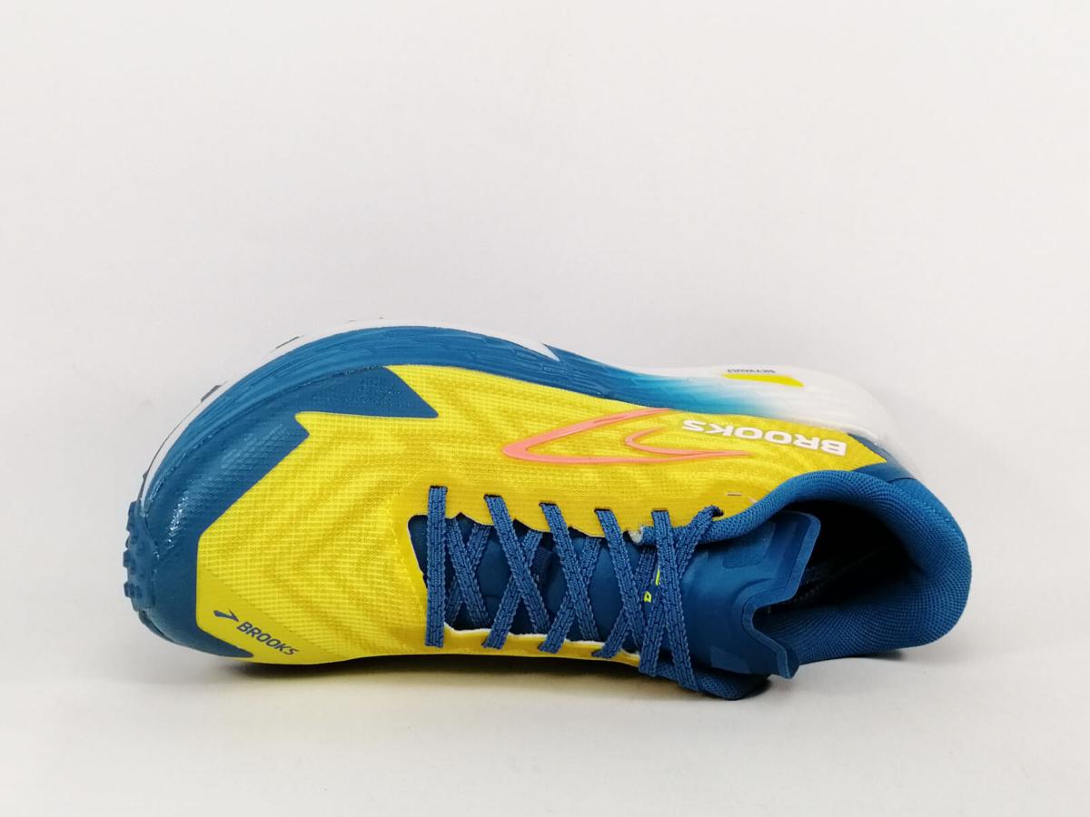 Basket de trail homme, grand amorti, très bonne adhérence et surtout le confort ! en destockage BROOKS catamount 4 jaune bleu à prix cassé.