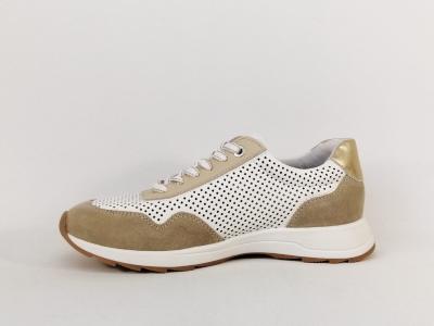 Sneakers femme élégante et confortable en cuir souple blanc et beige ajouré à lacets.